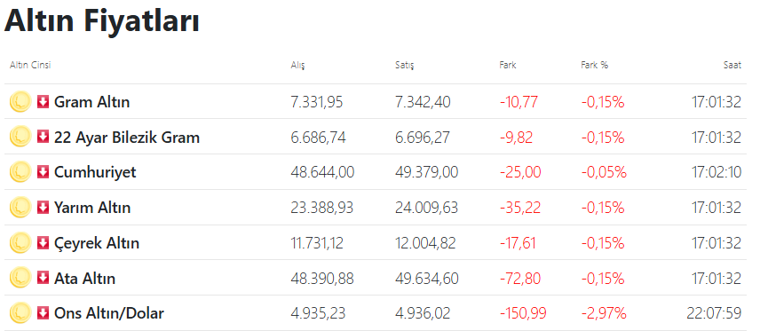 İç piyasada gram altın 7 bin liralardan 6 bin 900 bandına, gümüş gram ise 120 bandından 107 liraya kadar düştü.