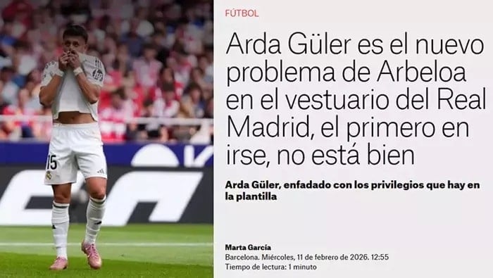 Elnacional’de ‘Arda Güler, Real Madrid Soyunma Odasında Arbeloa’nın Yeni Problemi’ başlığıyla yayınlanan makalede Arda Güler’in son dönemde aldığı forma süresinden rahatsız olduğu belirtildi.