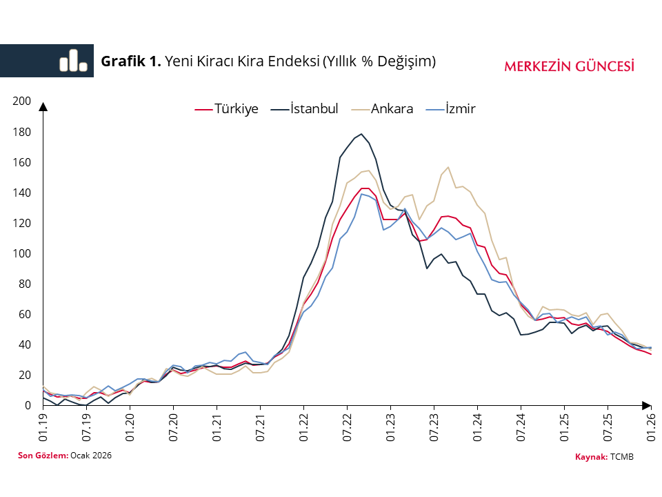 Merkez Bankası ekonomistleri, yeni kiracıların maruz kaldığı artış oranlarındaki bu yavaşlamanın, önümüzdeki aylarda TÜFE içindeki kira kalemini de aşağı çekeceğini öngörüyor. Bu veriler, TCMB’nin yıl sonu kira enflasyonu için belirlediği %30-36 aralığındaki hedefle uyumlu bir tablo çiziyor.