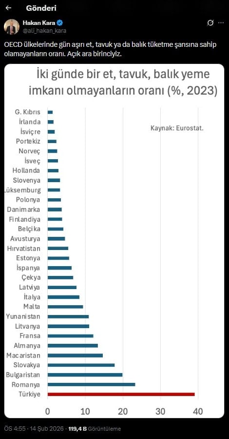 Kara’nın paylaştığı verilere göre, Türkiye’de 2014’e kadar düzenli protein tüketiminde iyileşme yaşanırken, 2018-2022 döneminde tablo yeniden bozuldu. 2023 itibarıyla ise halkın yaklaşık yüzde 40’ı gün aşırı et, tavuk veya balık tüketemedi.
