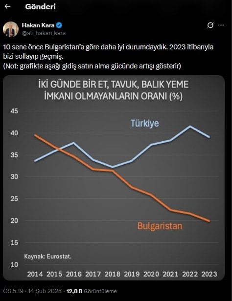 Veriler, Türkiye’nin 10 yıl önce Bulgaristan’a göre daha iyi durumda olduğunu, fakat 2023 itibarıyla Bulgaristan’ın Türkiye’yi geride bıraktığını gösterdi. Bulgaristan’da söz konusu oran yüzde 20’nin altına düşerken, Türkiye’de yüzde 35’in üzerinde seyretti.