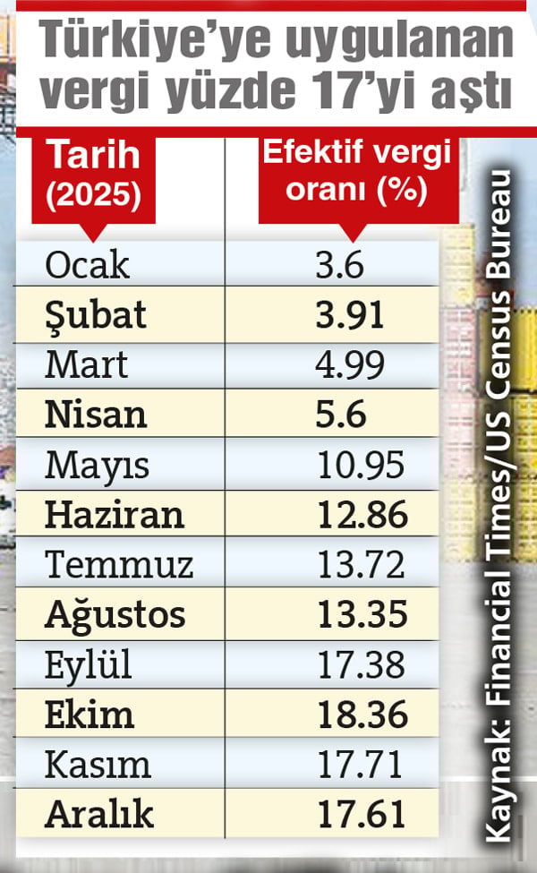 Türkiye’ye uygulanan tarife, dünya ortalamasını neredeyse ikiye katladı. ABD’ye ihracat yapan ülkelerin ödediği efektif gümrük vergisi oranı Aralık 2025’te yüzde 9.42 oldu. Ülke bazlı bakıldığında komşu Yunanistan’ın ABD’yle ticaretinde ödediği vergi oranı yüzde 11.59, Almanya’nın yüzde 9.27, Meksika’nın yüzde 4.38 seviyesinde bulunuyor.