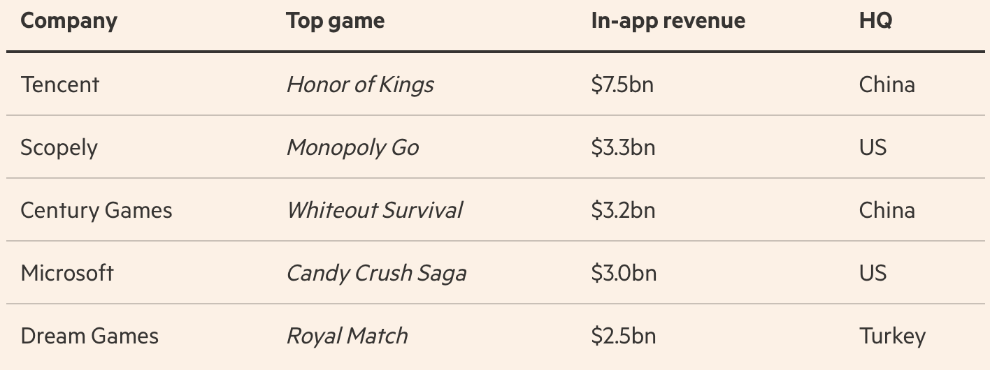 Financial Times gazetesinin haberine göre dünyanın en büyük mobil oyun şirketleri ve onların uygulama içi satın almalardan kaynaklanan gelirleri şöyle: