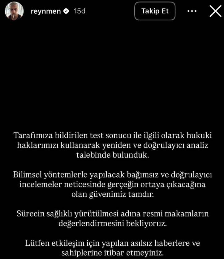 Tarafımıza bildirilen test sonucu ile ilgili olarak hukuki haklarımızı kullanarak yeniden ve doğrulayıcı analiz talebinde bulunduk. Bilimsel yöntemlerle yapılacak bağımsız ve doğrulayıcı incelemeler neticesinde gerçeğin ortaya çıkacağına olan güvenimiz tamdır. Sürecin sağlıklı yürütülmesi adına resmi makamların değerlendirmesini bekliyoruz. Lütfen etkileşim için yapılan asılsız haberlere ve sahiplerine itibar etmeyiniz.