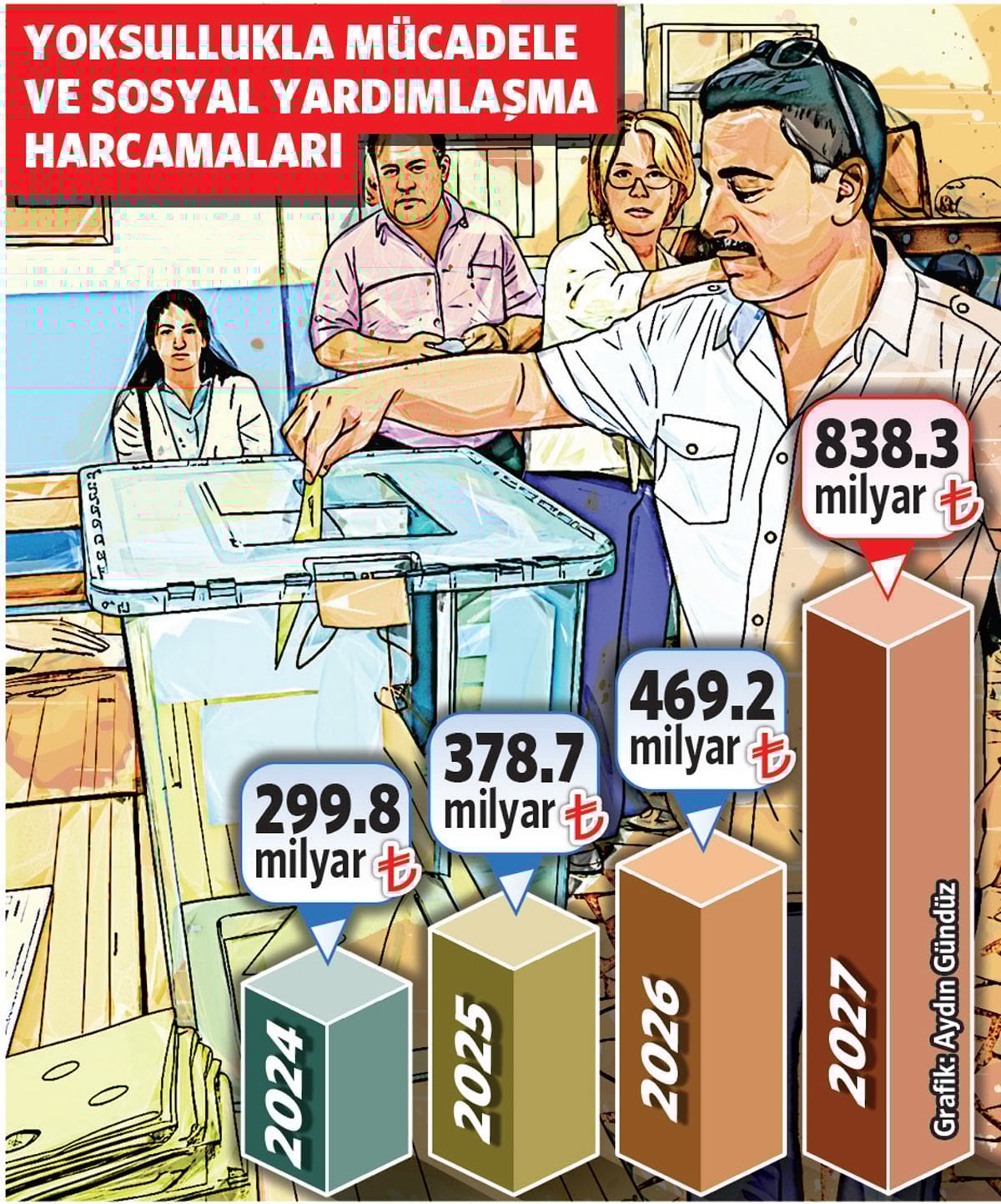 Ekonomistler gelecek yıl Türkiye’nin sandık başına gideceğini tahmin ederken, Aile ve Sosyal Hizmetler Bakanlığı da yoksullukla mücadele için ayırdığı kaynağı 2027’de neredeyse ikiye katlayacak. Bakanlık 2026 yılında sosyal yardımlara 284 milyar 470 milyon liralık kaynak ayırdı. Bütçe dışından da 184 milyar 721 milyon TL yoksullukla mücadele için kullanılacak. 2026’da toplam 469 milyar 192 milyon TL yoksullukla mücadele için harcanacak. 2027’de bu tutar 838 milyar 305 milyona çıkıyor. Bu artış 2027’de veya 2028’in başında yapılabilecek erken seçimin işareti olarak yorumlandı.